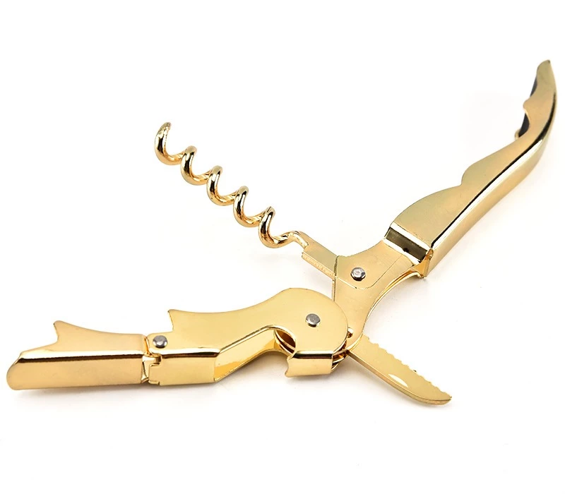 Saca rolhas de dois estágios inoxidável na cor Dourado, da linha de acessórios da Adega Boscato. Personalizado com a logomarca da empresa. Item indispensável na sua casa, ideal para abrir garrafas e para presentear.